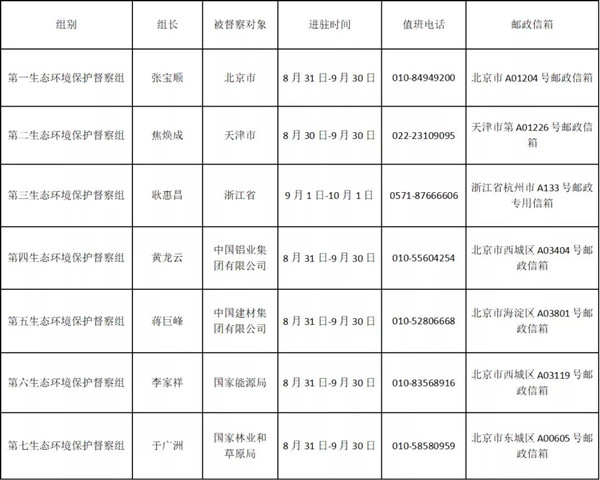 根据安排,第二轮第二批中央生态环境保护督察进驻时间约为1个月。进驻期间,各督察组分别设立专门值班电话和邮政信箱(详见下表),受理被督察对象生态环境保护方面的来信来电举报,受理举报电话时间为每天8:00-20:00。