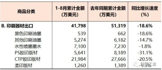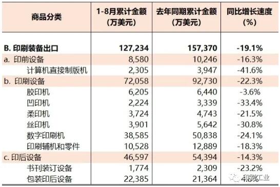 相关设备子项出口,计算机直接制版机2305万美元,同比下降41.6%;胶印机6205万美元,同比下降3.6%;凹印机2224万美元,同比下降33.4%;柔印机3724万美元,同比下降21.5%;丝印机3901万美元,同比下降30.8%;数字印刷机3.86亿美元,同比下降24.1%;印刷辅机和零件1.05亿美元,同比下降18.3%;书刊装订设备1774万美元,同比下降23.2%;包装印后设备2.24亿美元,同比增长4.8%。