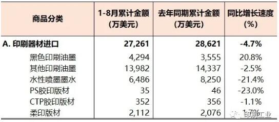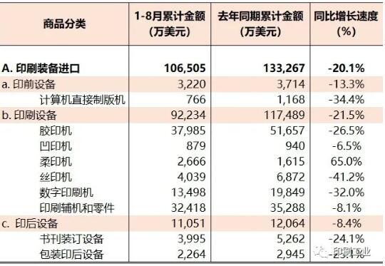 相关设备子项进口,计算机直接制版机766万美元,同比下降34.4%;胶印机3.80亿美元,同比下降26.5%;凹印机879万美元,同比下降6.5%;柔印机2666万美元,同比增长65.0%;丝印机4039万美元,同比下降41.2%;数字印刷机1.35亿美元,同比下降32.0%;印刷辅机和零件进口3.24亿美元,同比下降8.1%;书刊装订设备3995万美元,同比下降24.1%;包装印后设备2264万美元,同比下降23.1%。