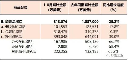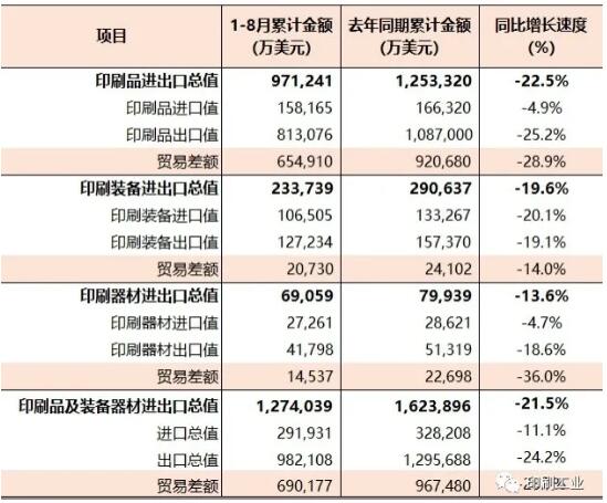 2020年1月—8月,国内印刷品、印刷装备、印刷器材进出口总值较去年同期下降21.5%,与上期同比数据百分数(-29.4%)相比减少了7.9个百分点。说明国内印刷产业相关商品的进出口贸易在逐步恢复。