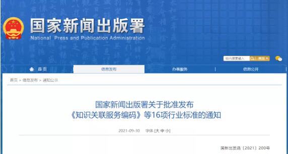 根据新闻出版领域行业标准制修订工作安排,全国新闻出版标准化技术委员会组织编制了《知识关联服务编码》等5项行业标准,全国印刷标准化技术委员会组织编制、修订了《印刷智能制造术语》等11项行业标准。经审核,现批准发布该16项行业标准,具体标准编号和名称如下。